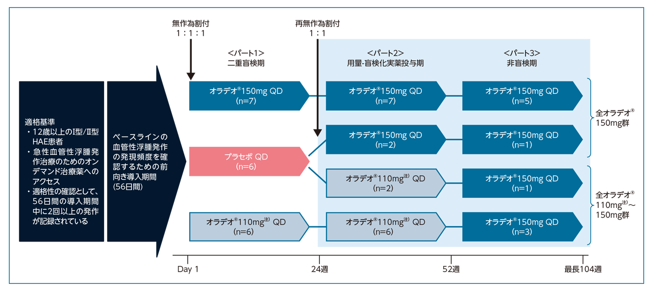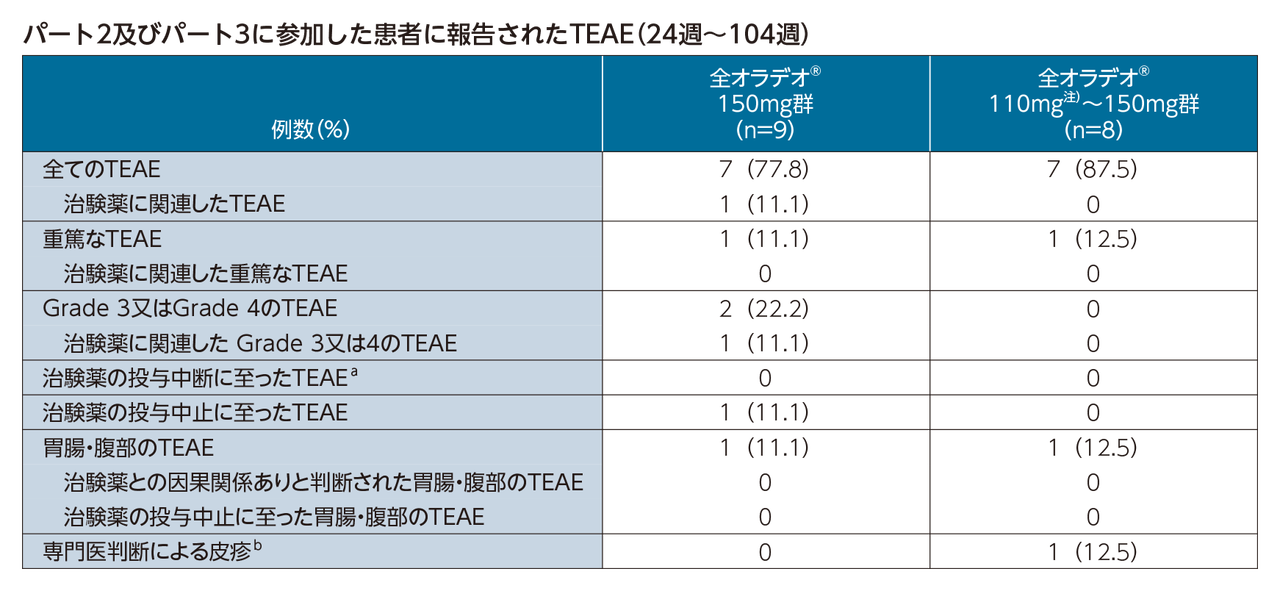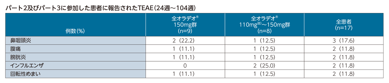 パート2及びパート3に参加した患者のオラデオ曝露期間の中央値(範囲)は554(77~650)日であった。パート2及びパート3の期間中、14例(82.4%)でTEAEを発現した。ほとんどのTEAEの重症度は軽度又は中等度であり、治験薬と関連のある重篤なTEAEは報告されなかった。