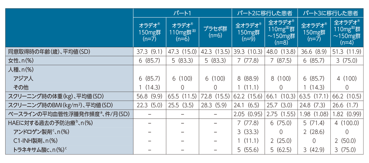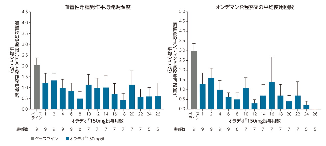 HAE発作発現頻度は、投与後1ヵ月から低下傾向が認められ、全150mg群の投与26ヵ月目における発作発現頻度の中央値は0回であった。また、投与26ヵ月目における1ヵ月あたりの平均オンデマンド治療薬の使用回数は0.0(0.0)回であった。