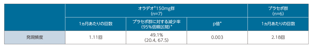 専門医判定による血管性浮腫発作の発現頻度は、オラデオ®150mg群で1.11回/月であり、プラセボ群の2.18回/月に対する減少率は、49.1%(95%CI:20.4, 67.5、p=0.003、負の二項回帰モデル※)と有意な減少が認められた。