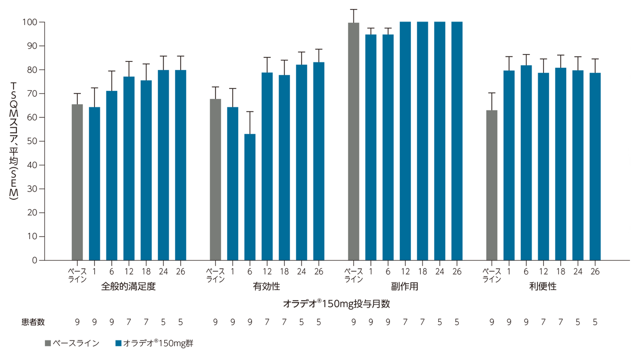 26ヵ月間の試験期間中、オラデオ®投与により、有効性、利便性ならびに全般的満足度スコアに改善傾向が認められた。