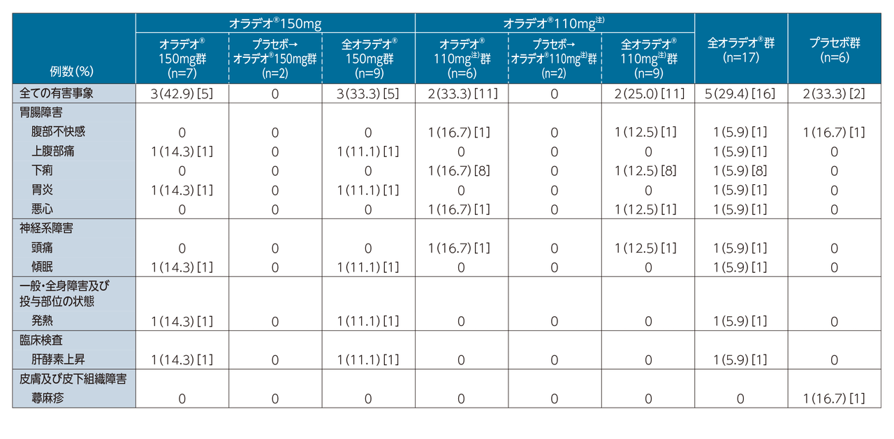 本試験における有害事象は、オラデオ®150mg群全体で3/9例(33.3%)、オラデオ®110mg注)群全体で2/8例(25.0%)、 プラセボ群で2/6例(33.3%)に認められた。投与中止に至った有害事象は、オラデオ®150mg群全体で肝酵素上昇が1例、 プラセボ群で蕁麻疹が1例に認められ、オラデオ®110mg注)群全体では認められなかった。 重篤な有害事象及び死亡例は各群とも認められなかった。各群の有害事象の内訳は、オラデオ®150mg群全体で上腹部痛、 胃炎、傾眠、発熱、肝酵素上昇各1例(11.1%)、オラデオ®110mg注)群全体で腹部不快感、下痢、悪心、頭痛各1例 (12.5%)、プラセボ群で腹部不快感、蕁麻疹各1例(16.7%)であった。