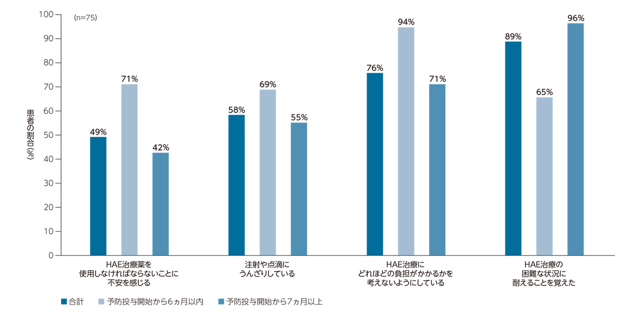 たとえば、現在の予防治療を6ヵ月以内に開始した患者の71%がHAE治療薬を継続的に使用することに対する不安を報告したが、7ヵ月以上前に開始した患者ではその割合は42%であった。