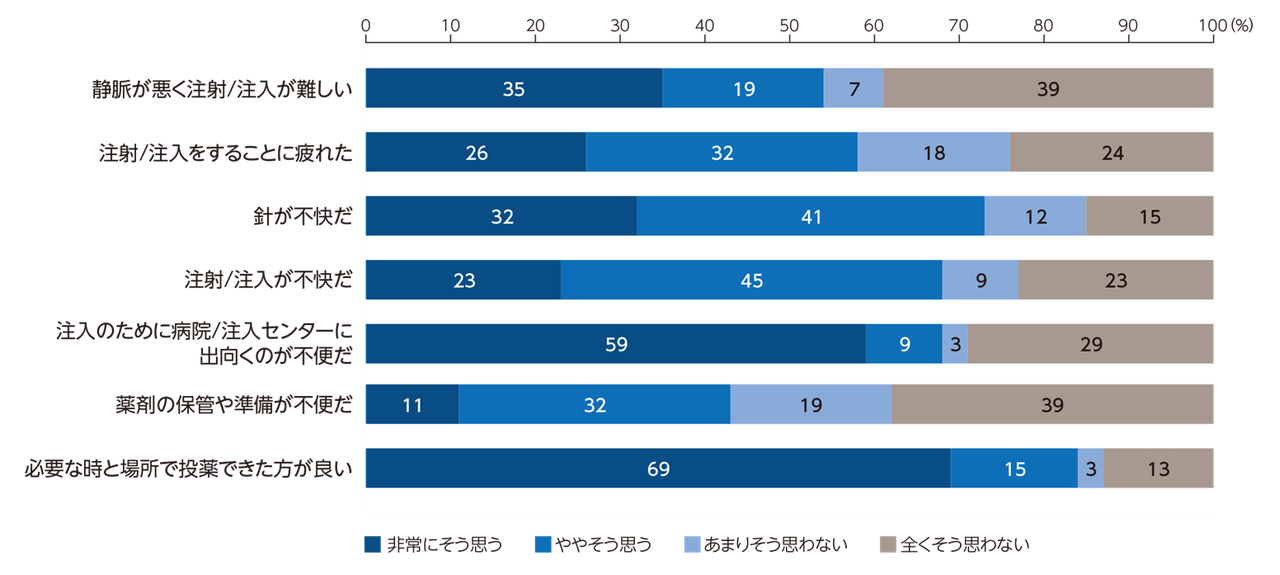 予防治療を受けているHAE患者の73%が「針が不快」、68%が「注射/点滴が不快」、84%が「必要な時と場所で投薬できることを望む」という設問に、「非常にそう思う」あるいは「ややそう思う」と回答した。