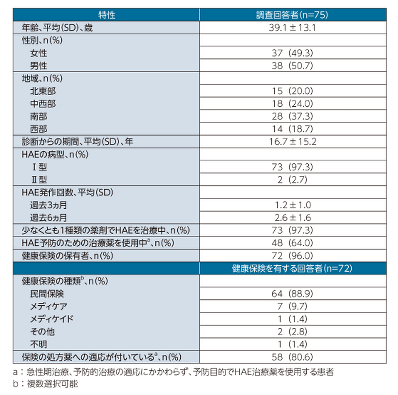 平均年齢は39.1歳で、HAEと診断されてから平均約17年が経過していた。患者は過去3ヶ月間で平均1.2回、過去6ヶ月間で平均2.6回の発作を報告した。患者の97%がHAEⅠ型であり、これはHAE患者集団全体で見られる割合よりわずかに高い。ほぼ全ての患者(97%)が、少なくとも1種類のHAE治療薬を服用していた。
