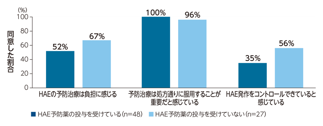 予防治療を受けているHAE患者の52%が「HAEの予防治療は負担に感じる」、100%が「予防治療は処方通りに服用することが重要だと感じている」、35%が「HAE発作をコントロールできていると感じている」という設問に同意した。