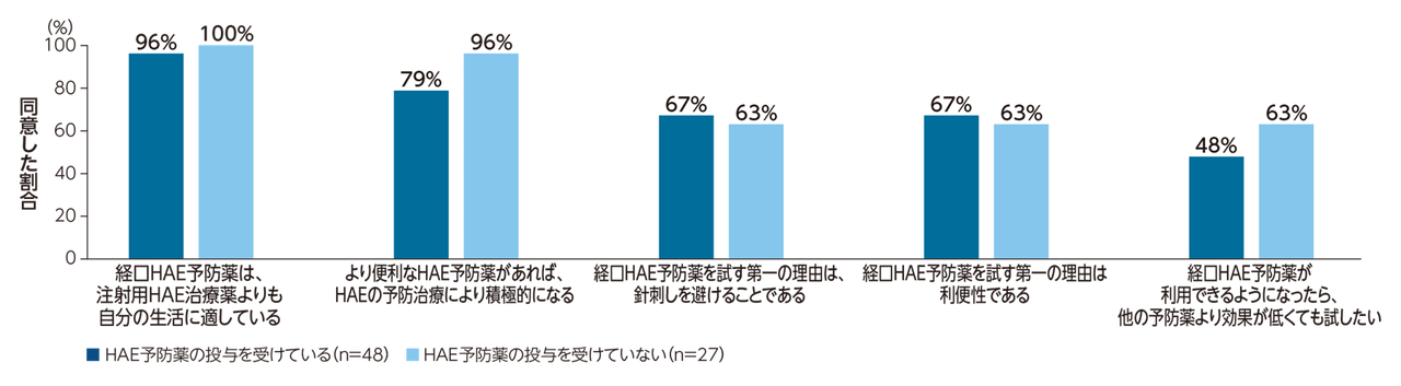 HAE予防薬の投与を受けている患者のうち、96%が「経口HAE予防薬は、注射用HAE治療薬よりも自分の生活に適している」、79%が「より便利なHAE予防薬があれば、HAEの予防治療により積極的になる」、67%が「経口HAE予防薬を試す第一の理由は、針刺しを避けることである」と「経口HAE予防薬を試す第一の理由は利便性である」、48%が「経口HAE予防薬が利用できるようになったら、他の予防薬より効果が低くても試したい」と回答している。