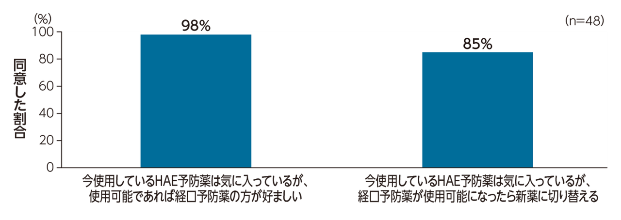 HAE予防薬を投与を受けている患者48例において、「現在投与している予防薬は気に入っているが、使用可能であれば経口予防薬の方が望ましい」に「そう思う」と回答した割合は98%であった。